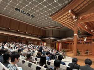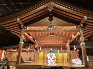 宮崎県北部、諸塚村の桂地区に伝わる桂神楽の公演が10月29日、東京都渋谷区の国立能楽堂でありました。22ある演目のうち、神前を清める「宮神楽」、荒神と神主役が問答を行う「荒神の言い句」、祝子全員がつとめる舞の「お大神」、刀舞の「かんずい」、素面の舞い出しに導かれ、面をかぶった八幡様が神前に座し、舞い出しが退くと八幡様の一人舞となる「座はり」の5番演目を披露。約520人の観客を魅了しました。写真の舞は「座はり」の一場面です。